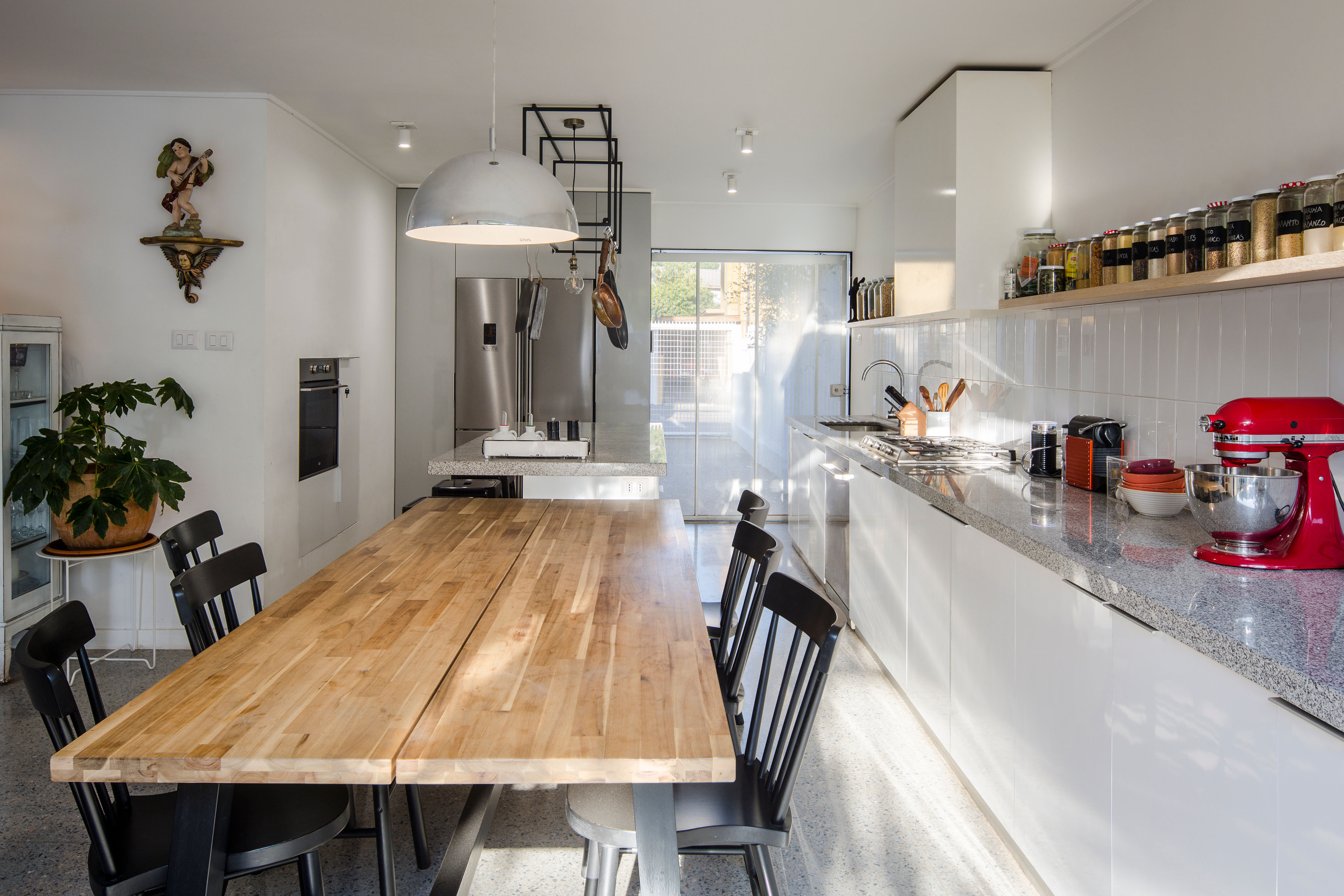 La casa construida en los sesenta, es parte de una hilera de casas de dos pisos, dispuesta con la calle hacia el oriente y los jardines hacia el poniente. Este mismo diseño de hilera y otros se repiten dentro de un amplio territorio de la comuna, conformando barrios de densidad media, compactos y caminables, atributos que hoy valoramos como el buen urbanismo de escala humana de los barrios de Ñuñoa. Esta tipología, muy atingente al habitar urbano contemporáneo y con innumerables ventajas sobre otras, ha sido eliminada casi por completo de la oferta del inmobiliaria chilena, reemplazándose por dos únicas opciones; la casa aislada en condominio o la torre de departamentos, con consecuencias desastrosas sobre las ciudades.
